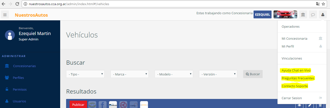 La segunda forma de ingresar a la Mesa de ayuda es desde la página Nuestros Autos, haciendo click en el ícono del extremo superior derecho, lo cual desplegará una barra de opciones: Ayuda Chat en Vivo, Preguntas Frecuentes y Contacto Soporte.