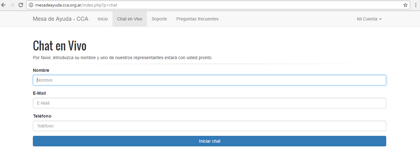 Deberá completar los datos para poder iniciar el chat en vivo con un operador en línea. Una vez iniciado el Chat, le llegará un mail con el usuario creado y una contraseña: