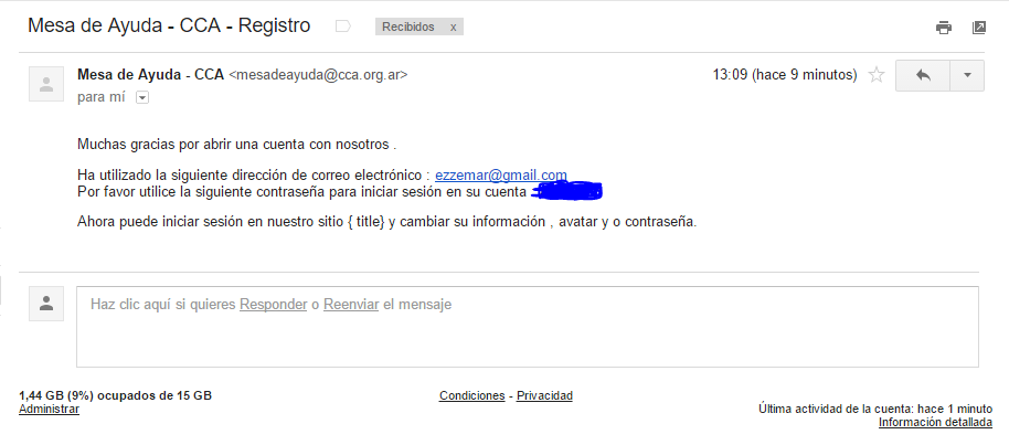 A su vez, usted recibirá un mail a la casilla que ingresó al crear el ticket. Este mail le proporcionará una contraseña con la cual usted deberá ingresar en la mesa de ayuda (http://mesadeayuda.cca.org.ar) para poder seguir ingresando y asi ver el estado de sus tickets soporte o crear otro.