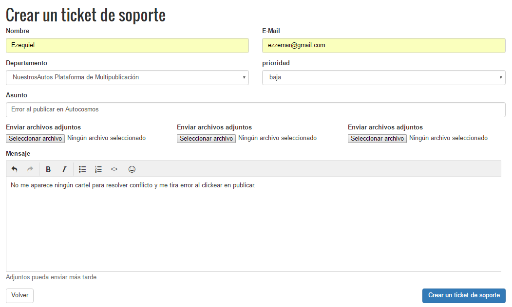 Una vez que haya ingresado a esta ventana, deberá ingresar una serie de datos, por ej: Nombre, mail, podrá ponerle un título al problema (asunto), elegir la prioridad de su problema (baja, media o alta), adjuntar archivos (hasta tres) y describir el problema. Luego de completar todo podrá crear el ticket.